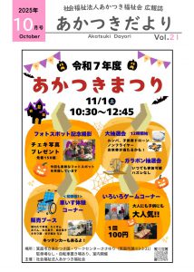広報誌 あかつき福祉会のいろいろな情報を「あかつきだより」として発行いたしております。 【第21号】 広報誌「あかつきだより」第21号 令和7年10月1日発行 【第20号】 広報誌「あかつきだより」第20号 令和7年7月1日発行 【第19号】 広報誌「あかつきだより」第19号 令和7年4月1日発行 【第18号】 広報誌「あかつきだより」第18号 令和7年1月1日発行 【第17号】 広報誌「あかつきだより」第17号 令和6年10月1日発行 【第16号】 広報誌「あかつきだより」第16号 令和6年7月1日発行 【第15号】 広報誌「あかつきだより」第15号 令和6年4月1日発行 【第14号】 広報誌「あかつきだより」第14号 令和6年1月1日発行 【第13号】 広報誌「あかつきだより」第13号 令和5年10月1日発行 【第12号】 広報誌「あかつきだより」第12号 令和5年7月1日発行 【第11号】 広報誌「あかつきだより」第11号 令和5年4月1日発行 【第10号】 広報誌「あかつきだより」第10号 令和5年1月1日発行 【第9号】 広報誌「あかつきだより」第9号 令和4年10月1日発行 【第8号】 広報誌「あかつきだより」第8号 令和4年7月1日発行 【第7号】 広報誌「あかつきだより」第7号 令和4年4月1日発行 【第6号】 広報誌「あかつきだより」第6号 令和4年1月1日発行 【第5号】 広報誌「あかつきだより」第5号 令和3年10月1日発行 【第4号】 広報誌「あかつきだより」第4号 令和3年7月1日発行 【第3号】 広報誌「あかつきだより」第3号 令和3年4月1日発行 【第2号】 広報誌「あかつきだより」第2号 令和3年1月1日発行 【第1号】 広報誌「あかつきだより」創刊号 令和2年10月1日発行