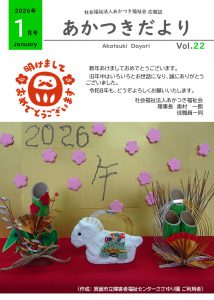 広報誌 あかつき福祉会のいろいろな情報を「あかつきだより」として発行いたしております。 【第22号】 広報誌「あかつきだより」第22号 令和8年1月1日発行 【第21号】 広報誌「あかつきだより」第21号 令和7年10月1日発行 【第20号】 広報誌「あかつきだより」第20号 令和7年7月1日発行 【第19号】 広報誌「あかつきだより」第19号 令和7年4月1日発行 【第18号】 広報誌「あかつきだより」第18号 令和7年1月1日発行 【第17号】 広報誌「あかつきだより」第17号 令和6年10月1日発行 【第16号】 広報誌「あかつきだより」第16号 令和6年7月1日発行 【第15号】 広報誌「あかつきだより」第15号 令和6年4月1日発行 【第14号】 広報誌「あかつきだより」第14号 令和6年1月1日発行 【第13号】 広報誌「あかつきだより」第13号 令和5年10月1日発行 【第12号】 広報誌「あかつきだより」第12号 令和5年7月1日発行 【第11号】 広報誌「あかつきだより」第11号 令和5年4月1日発行 【第10号】 広報誌「あかつきだより」第10号 令和5年1月1日発行 【第9号】 広報誌「あかつきだより」第9号 令和4年10月1日発行 【第8号】 広報誌「あかつきだより」第8号 令和4年7月1日発行 【第7号】 広報誌「あかつきだより」第7号 令和4年4月1日発行 【第6号】 広報誌「あかつきだより」第6号 令和4年1月1日発行 【第5号】 広報誌「あかつきだより」第5号 令和3年10月1日発行 【第4号】 広報誌「あかつきだより」第4号 令和3年7月1日発行 【第3号】 広報誌「あかつきだより」第3号 令和3年4月1日発行 【第2号】 広報誌「あかつきだより」第2号 令和3年1月1日発行 【第1号】 広報誌「あかつきだより」創刊号 令和2年10月1日発行
